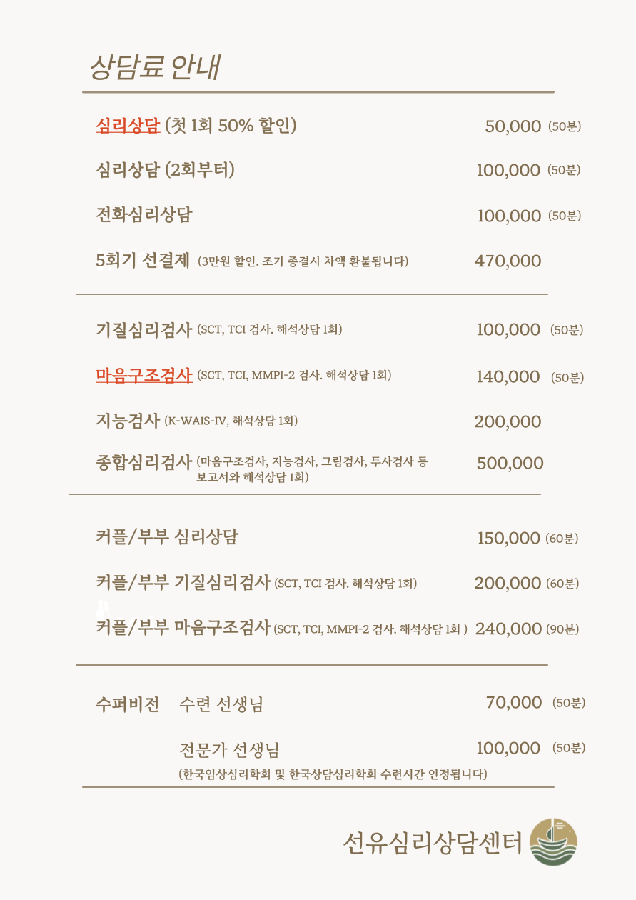 (심리상담은 예약제로 진행되기에 갑작스러운 노쇼나 예약 변경은 다른 분들의 상담 기회를 제한할 수 있습니다. 이러한 이유로 불가피하게 24시간 이내 급작스러운 변경 시 일정 비용이 청구될 수 있는 점 양해 부탁드립니다.)